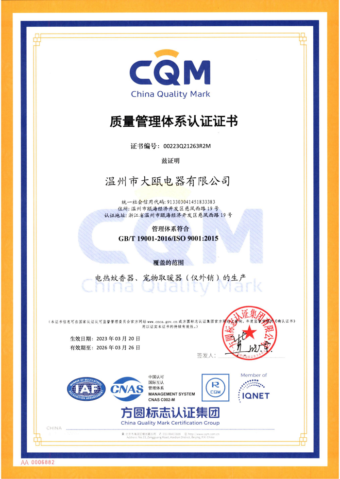 秉承“以人為本,以質(zhì)取勝”的經(jīng)營理念,三十余載櫛風沐雨,踐行“成就客戶、價值為本、誠信務(wù)實、追求卓越”的核心價值觀。大甌公司堅持以產(chǎn)研一體化的經(jīng)營模式與差異化的競爭戰(zhàn)略為基點,持續(xù)推出細分市場上的多種類產(chǎn)品,豐富產(chǎn)品矩陣,滿足消費者多樣化需求,助力新型驅(qū)蚊行業(yè)高速發(fā)展。